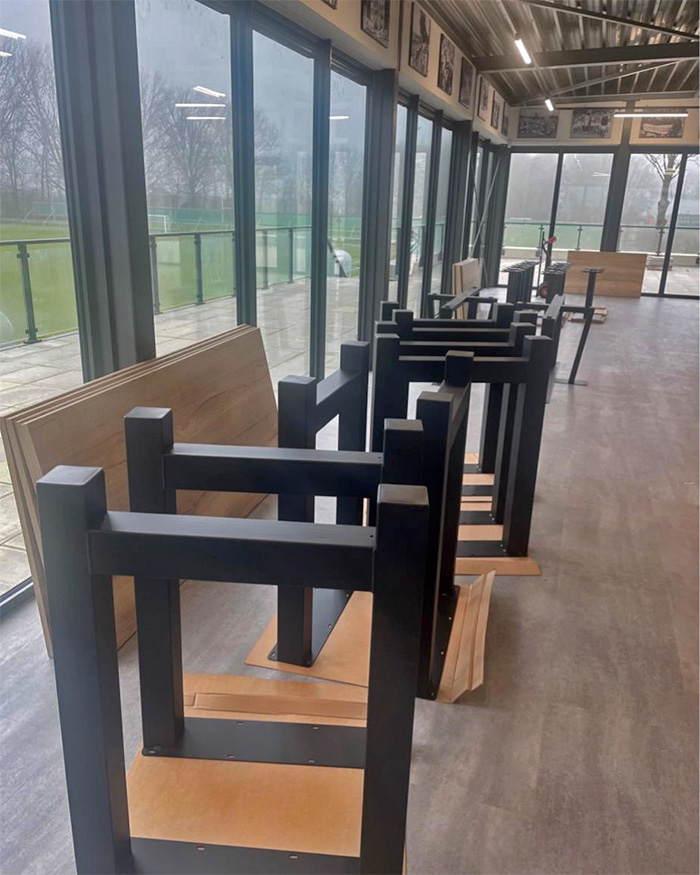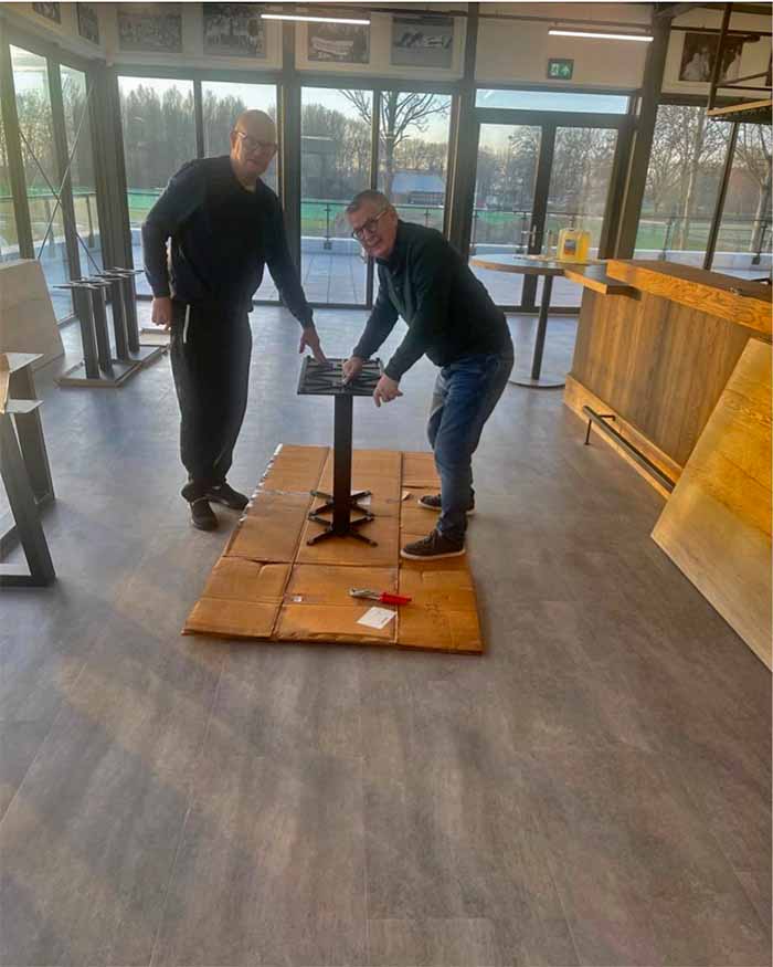 Naast schoonmaken is begonnen met het in elkaar zetten van het meubilair voor de kantine, beheerderruimte, commissiekamers en bestuurskamer. Dat vraagt om teamwork: niet alles past in de lift, dus worden grotere delen met mankracht naar boven gebracht.