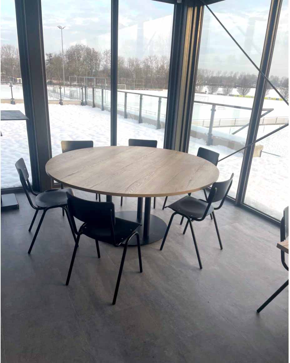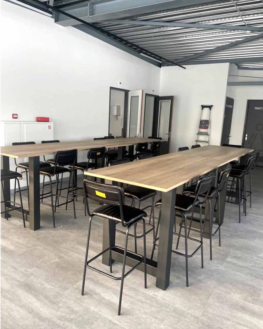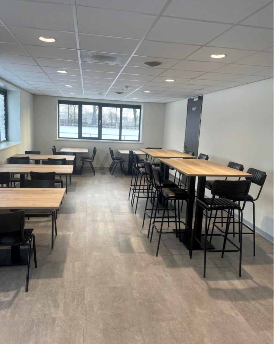 Nadat vorige week al het meubilair voor binnen in elkaar was gezet, is dit deze week door de interieurcommissie op de juiste plek geplaatst. Een mooie mix van tafels in verschillende groottes en vormen zorgt voor een prettige en functionele indeling. Van ronde tafels tot lange, hoge tafels waar je met je team aan kunt aanschuiven.