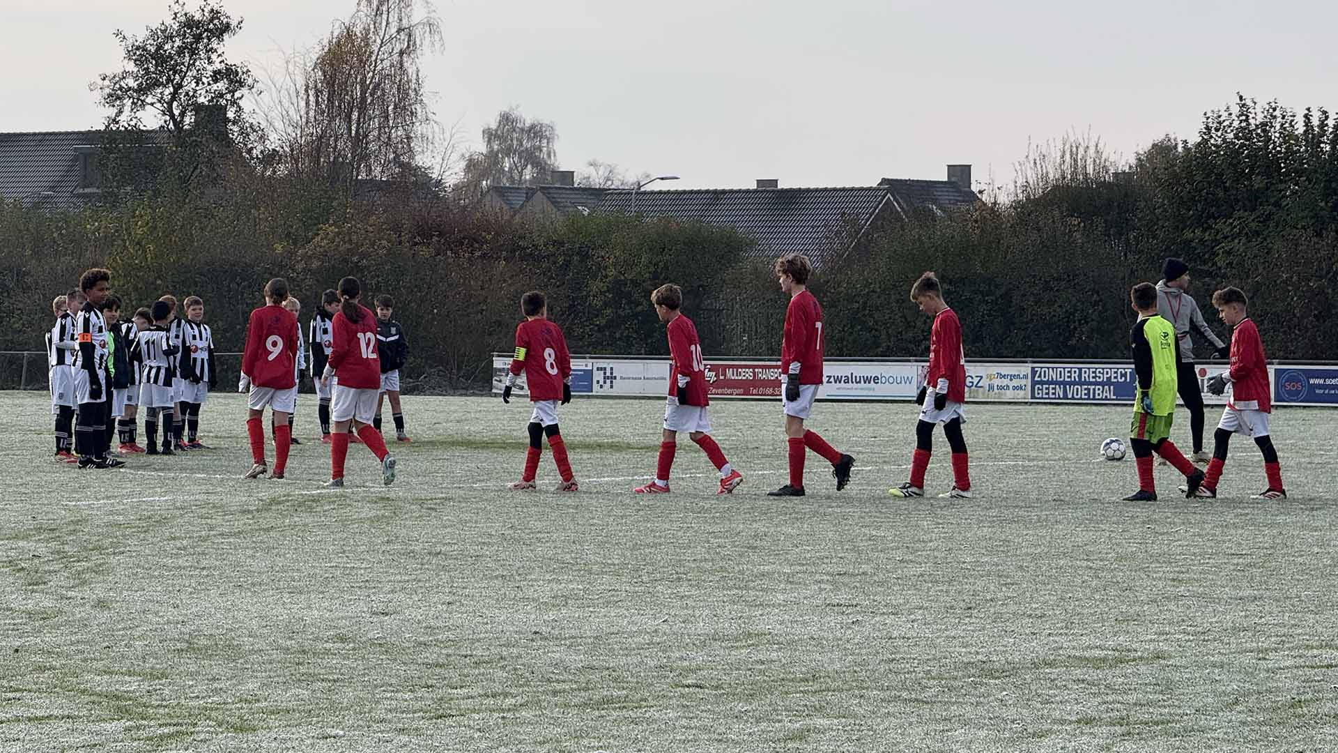 Het was guur, koud en vroeg. Toch stonden de jongens van Dubbeldam JO13-3 om 09.30 uur paraat, compleet ingepakt, inclusief thermoshirts, handschoenen en rode neuzen. Vandaag was diep ademhalen zonder te hoesten een uitdaging. Maar voetballen? Daar lieten ze zich niet van weerhouden. Het veld was nog bevroren, maar toch ging de bal het veld op!