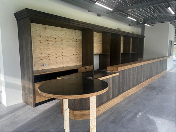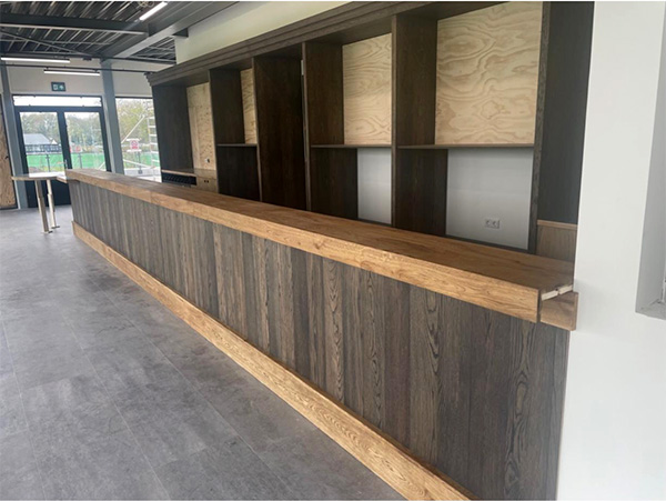 De PVC-vloer is inmiddels gelegd door Groeneveld Services, met dank aan Ricky Klootwijk en Heditex BV voor de levering van de materialen nodig voor het leggen van deze mooie vloer. Hierdoor kon Concours Projectbouw, zowel boven als beneden, starten met het plaatsen van de bar. Wat een verschil maakt dat meteen! Ook de gietvloer in de keukens heeft zijn definitieve kleur gekregen, wat het geheel een strakke uitstraling geeft. Komende week begint Schoondergang van Zwanenburg met het plaatsen van de keukens – het gebouw krijgt steeds meer karakter.
